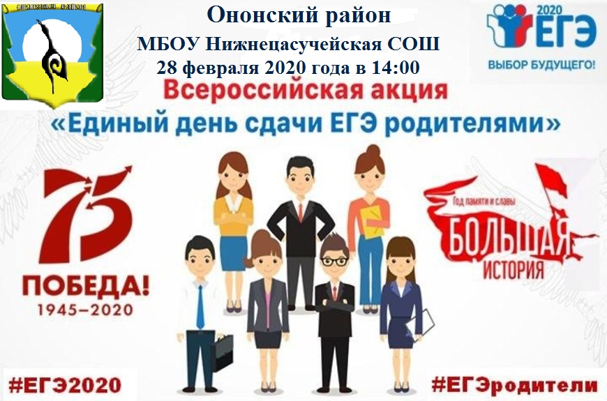 28 февраля 2020 года в Ононском районе в МБОУ Нижнецасучейская СОШ состоится Всероссийская акция «Единый день сдачи ЕГЭ родителями». В этом году акция посвящена Году памяти и славы.